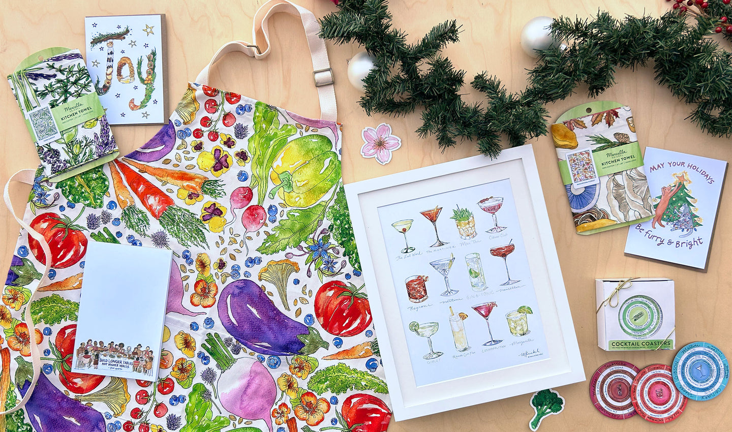 While Marcella is most well-known for her dynamic paintings of food, she brings her distinctive style and bright watercolor palette to pieces celebrating home, social justice initiatives, and all things homegrown. She aims to illuminate people and causes that deserve more of a spotlight in our ever-changing world in her personal art practice, collaborations and client projects.