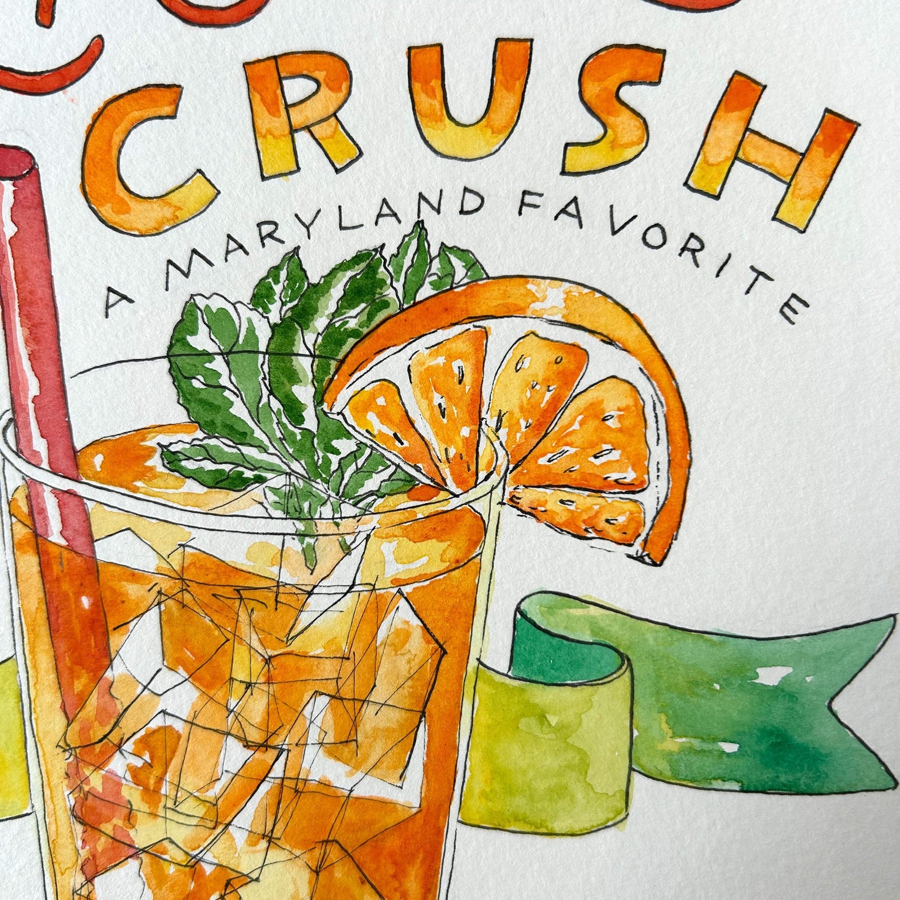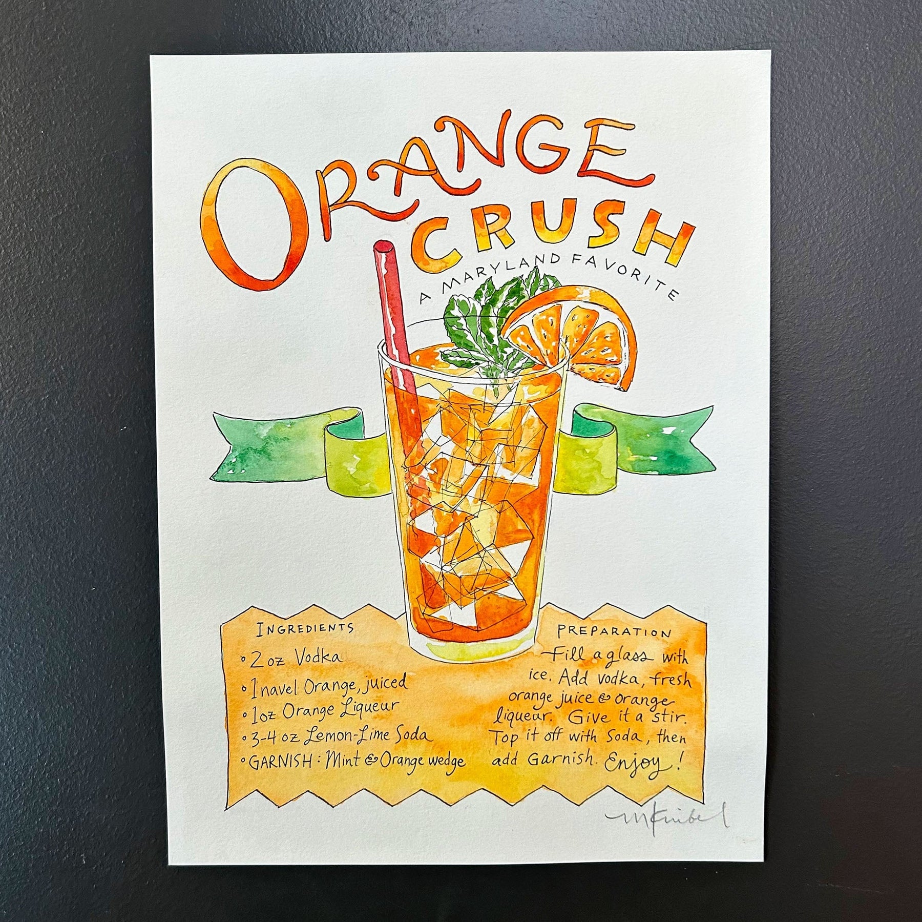 Original watercolor painting of an Orange Crush Cocktail with the recipe. A Maryland favorite!