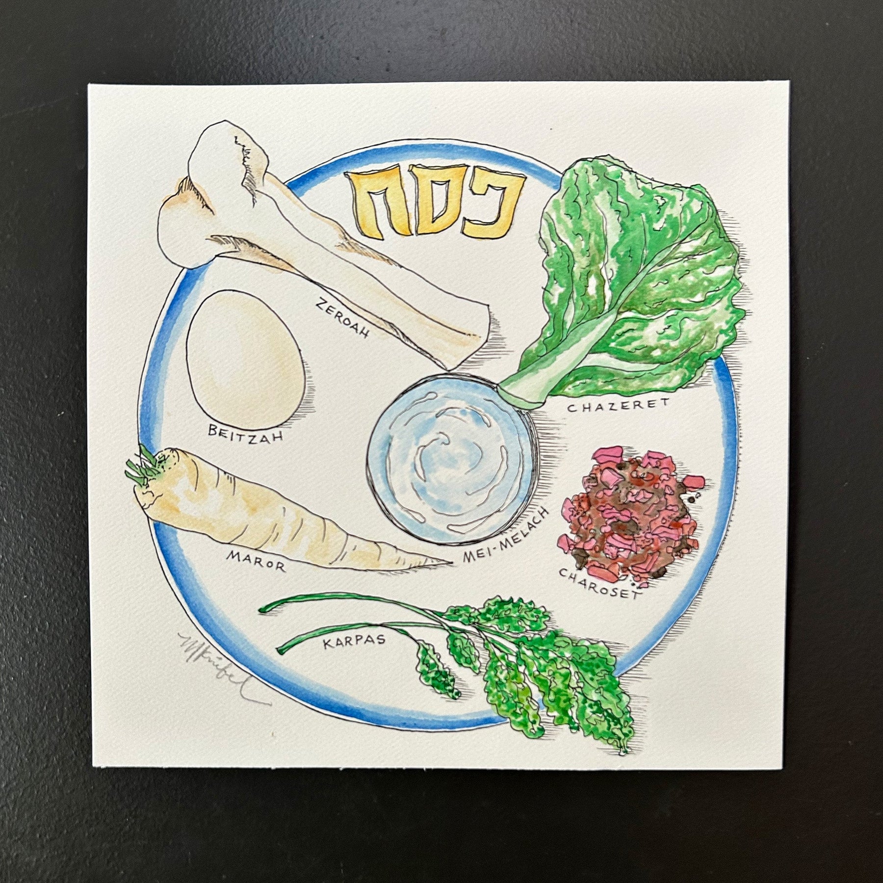 This original watercolor painting of four pies is on 300lb 9"x12" cold press watercolor paper in a custom matte finish frame.